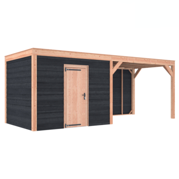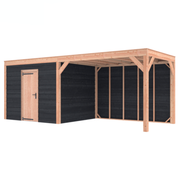 Dit modern vormgegeven tuinverblijf biedt een perfecte balans tussen uitstraling en functionaliteit. De totale afmetingen zijn 245 cm hoog, 645 cm breed en 255 cm diep. De berging heeft een breedte van 328,5 cm met een deur van 75cm x192,5cm.De overkapping heeft een breedte van 278,5 cm en een doorloophoogte van 224 cm.Of je nu een gezellige loungehoek, een opslagruimte of een overdekte plek voor tuinfeestjes zoekt, dit Douglas tuinverblijf is een aanwinst voor iedere tuin.Natuurlijke uitstraling, degelijke kwaliteit.De wanden zijn bekleed met Zwart Zweeds rabat en de constructie is gemaakt van onbehandeld Douglas met stevige staanders van 12x12cm.De keuze voor onbehandeld Douglas hout biedt een authentieke uitstraling en staat ook garant voor een lange levensduur.Functies:Door een overkapping mét opslag te kiezen, heb je een praktische ruimte om bijvoorbeeld tuingereedschap of fietsen op te slaan en af te sluiten, maar ook voor een ruimte om heerlijk beschut te ontspannen in uw eigen tuin. Het beste van 2 werelden!Klaar voor een groene toekomst:Dit modern vormgegeven tuinverblijf is speciaal ontworpen om zonnepanelen of een sedum dak te kunnen ondersteunen, Hierdoor is dit verblijf een duurzame en milieuvriendelijke aanvulling op uw tuin is.Zelf aan de slagDankzij de duidelijke opbouwomschrijving, meegeleverde bevestigingsmaterialen en op maat gezaagde onderdelen, is de installatie van dit tuinhuis een haalbare klus voor iedere gemiddelde doe-het-zelver. Dak bekleding:Wij raden aan om deze Douglas overkapping te voorzien van een EPDM Dak bekleding voor een lekvrij dak (Let op: los bij te bestellen).Onderhoud:Bij het kopen van een overkapping is onderhoud een aandachtspunt… Met Douglas hout heb je het goed voor elkaar, Douglas is namelijk van zichzelf al een sterke houtsoort. Het gaat zonder extra behandeling eenvoudig 10 tot 15 jaar mee. Om de maximale levensduur te verlengen kun je gebruik maken van speciale Douglas beits of Douglas olie en elke 2 jaar opnieuw beitsen of oliën.
