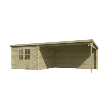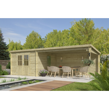 Tuinhuis met overkapping Esther vurenhout geïmpregneerd 681 x 292 cm is een moderne en ruime blokhut met overkapping. Je gebruikt dit tuinhuis als berging, overdekte zitplek of combinatie daarvan. De buitenafmetingen zijn 681 x 292 cm en de nokhoogte bedraagt 217 cm. Het tuinhuis is gemaakt van geschaafd vurenhout en wordt geïmpregneerd geleverd. De wanden zijn opgebouwd uit massieve balken van 2,8 cm dik.