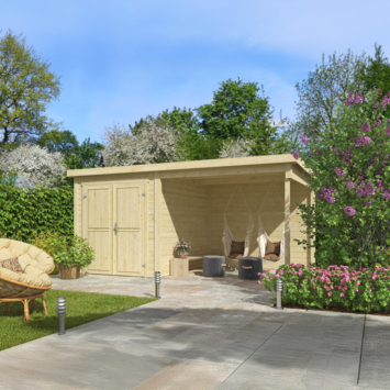 Tuinhuis met overkapping Finn vurenhout onbehandeld 450 x 250 cm combineert een ruime berging met een overdekte zitplek. Je gebruikt dit tuinhuis om fietsen, tuingereedschap en andere spullen netjes op te bergen, terwijl je onder de overkapping beschut buiten kunt zitten. De constructie is gemaakt van onbehandeld vurenhout met 28 mm dikke wanddelen in mes-en-groef, wat zorgt voor een stevige en gesloten opbouw.