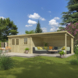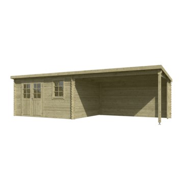 Tuinhuis Joy 760 x 275 cm geïmpregneerd is een ruime blokhut met overkapping die zorgt voor extra leefruimte in de tuin. Onder de overkapping zit je beschut tegen zon en regen, terwijl het afgesloten deel ideaal is voor het opbergen van tuingereedschap, fietsen of andere spullen.