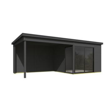 Dit modern vormgegeven tuinhuis Julia heeft een fundamentmaat van 646cm(b) x 295cm(d). De overkapping is 350cm breed. De 28mm dikke vurenhouten wanddelen zijn uitgevoerd met mes en groef. De stapelbouw methode in combinatie met hoekpalen en schroefsysteem zorgt voor een zeer sterke constructie. Dit mooie design tuinhuis wordt geleverd inclusief een aluminium schuifpui in de voorwand waarvan beide panelen schuivend zijn en het linker paneel afsluitbaar is met een sleutel. In de linkerzijde wordt een vast aluminium glaspaneel gemonteerd. De aluminium delen zijn mat antracietgrijs van kleur en de panelen zijn voorzien van enkelglas. Dit tuinhuis is door de enorme lichtinval ook geschikt als tuinkamer, atelier of als tuinkantoor. Onder de overkapping is het heerlijk beschut vertoeven. U kunt dit tuinhuis ook in spiegelbeeld monteren. Het basispakket wordt geleverd inclusief montagehandleiding, onderdelenlijst en uiteraard alle benodigde bevestigingsmaterialen. Voor langdurig plezier van uw tuinhuis, wordt aangeraden een EDPM dakbedekkingpakket aan te kopen om waterdichtheid te verzekeren. Dit stapelbouwbouw systeem is door een handige doe-het-zelver goed zelf te monteren, je moet wel even met z'n tweeën zijn. Dit tuinhuis wordt als bouwpakket bij u thuis geleverd.