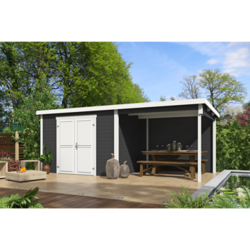 Het tuinhuis Kjeld 550x250 heeft een fundamentmaat van 550cm(b) x 250cm(d). De massieve 28mm dikke vurenhouten wanddelen zijn uitgevoerd met mes en groef. De stapelbouw methode in combinatie met hoekpalen en schroefsysteem zorgt voor een zeer sterke constructie. Dit moderne en strak vormgegeven tuinhuis met haar dubbele dichte deur is bijzonder geschikt als berging voor uw tuinspullen met daarbij een overkapping om ook heerlijk beschut te kunnen chillen. Het basispakket wordt geleverd inclusief een duidelijk montagehandleiding, onderdelenlijst en uiteraard alle benodigde bevestigingsmaterialen, zoals het deurbeslag. Voor langdurig plezier van uw tuinhuis, wordt aangeraden een EDPM dakbedekkingpakket aan te kopen om waterdichtheid te verzekeren. Het stapelbare blokhut systeem is door de handige doe-het-zelver prima zelf te monteren en dit tuinhuis wordt als bouwpakket bij u thuis geleverd.