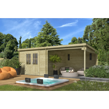 Tuinhuis met overkapping Olaf vurenhout geïmpregneerd 601 x 319 cm is een tuinhuis met overkapping dat je kunt gebruiken voor opslag en om beschut buiten te zitten. Deze blokhut heeft een ruime indeling en is geschikt als berging voor tuinspullen of als plek om droog onder de overkapping te staan.