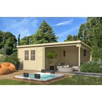 Tuinhuis met overkapping Olaf vurenhout onbehandeld 581 x 292 cm is een ruime blokhut met overkapping die je gebruikt als opslagruimte en beschutte zitplek in de tuin. Het tuinhuis is gemaakt van geschaafd vurenhout en wordt onbehandeld geleverd. Dankzij de stapelbouwmethode met massieve wandbalken van 2,8 cm dik is de montage overzichtelijk en goed te doen voor de gemiddelde klusser.