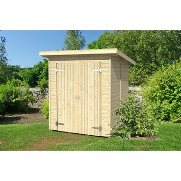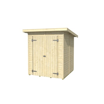 Het is een compact tuinhuis gemaakt van vurenhout. Het schuurtje is uitgevoerd met een lessenaardak en is makkelijk te monteren met de geleverde 13,5 mm dikke panelen. De blokhut wordt overigens geleverd met dakleer en vloer.