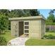 Dit tuinhuis is gemaakt van geïmpregneerd vurenhout en heeft massieve wandbalken met een dikte van 28 mm. Dankzij de stapelbouwmethode worden de planken met tand- en groefprofielen laag voor laag op elkaar geplaatst, zonder steunpilaren. Dit zorgt voor een stevige constructie en een strak geheel. Het dak heeft een platte dakconstructie met een lichte helling en een kleine overstek, zodat regenwater op natuurlijke wijze wordt afgevoerd.