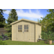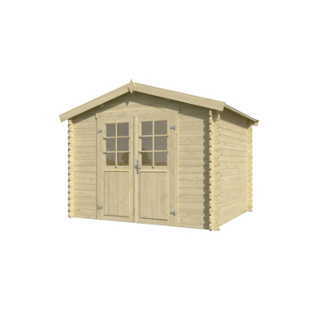 Tuinhuis Narcis vurenhout onbehandeld 250 x 307 cm is een ruime blokhut met overkapping die geschikt is als berging of werkruimte. De buitenmaat bedraagt 250 x 307 cm en het hoogste punt van het dak ligt op 234 cm. Dit tuinhuis is gemaakt van geschaafd vurenhout en wordt onbehandeld geleverd. De wanden zijn opgebouwd uit massieve balken van 2,8 cm dik.