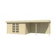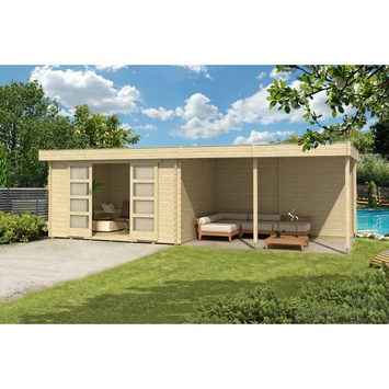 Een groot tuinhuis met een binnen- en buitenruimte? Dat is tuinhuis Nebraska 380x300cm blank heeft een oppervlakte van 8,7m² en is in meerdere opzichten handig. Zo kun je er je grasmaaier, schop en ander tuingereedschap in bewaren, je houten blokken in opslaan of je terrasset in kwijt. Het materiaal waarvan dit tuinhuis is gemaakt is Noord-Europees vurenhout, een sterke, betaalbare en relatief lichte houtsoort. Het vurenhout is onbehandeld, dus GAMMA adviseert je om het hout te impregneren om deze vuil- en waterafstotend te krijgen. De dubbele schuifdeuren zijn verhoogd en hebben heldere kunststoffen ramen, zodat er licht naar binnen valt. Ook heeft de blokhut een cilinderslot, zodat je hem kunt afsluiten. Het dak bestaat uit EPDM-dakrubber, een degelijk en waterdicht materiaal dat doorgaans 50 jaar meegaat. De twee wandelementen zorgen voor beschutting en veel privacy. Dit stapelbouwtuinhuis wordt geleverd inclusief EPDM-dakrubber, dakdoorvoer, afvoerpijp, dakverankering, hang- en slotwerk en met een duidelijke opbouwbeschrijving, zodat je het huis eenvoudig zelf in elkaar kunt zetten. GAMMA adviseert je om je tuinverblijf na 3 tot 5 jaar jaarlijks te onderhouden. Kortom: een sfeervol tuinhuis met veel ruimte.
