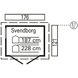 De blokhut Svendborg is gemaakt van Noord-Europees vurenhout. De blokhut heeft een rechthoekig grondoppervlak van 1 meter 75 bij 1 meter 21. De blokhut heeft een oppervlak van 2,1 vierkante meter en 4,4 kubieke meter inhoud. Svendborg heeft een puntdak, het hoogste punt meet 2 meter 32. De wanden van de blokhut zijn 1,9 centimeter dik. De blokhut is uitgerust met een dubbele deur van bijna 1 meter 20 breed en een raam.