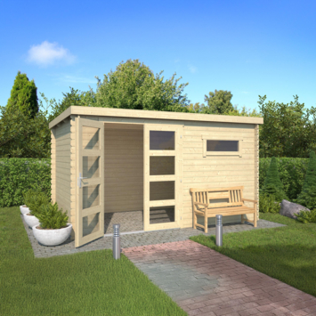 De constructie bestaat uit massief Noord-Europees vurenhout met een wanddikte van 28 mm. Het hout wordt onbehandeld geleverd, zodat je zelf kiest hoe je het afwerkt. De stapelbouwmethode met tand-en-groef zorgt voor een stabiele opbouw. De dubbele deuren met glas en het vaste raam zorgen voor extra licht in het tuinhuis en zijn afsluitbaar met een cilinderslot.
