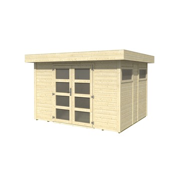 Het tuinhuis Vermont 300x245 cm is een tuinhuis gemaakt van vurenhout. Het huisje is voorzien van een plat dak bekleed met dakleer. Het tuinhuis is 300 bij 245 centimeter groot en heeft een wanddikte van 19 millimeter. De dubbele deuren zijn 175 bij 139 centimeter groot en zijn voorzien van ruiten van kunststof matglas. Daarmee is de inkijk beperkt wanneer het huisje afgesloten is. Dit tuinhuis wordt geleverd inclusief een bijpassende houten vloer, dakleer en hang- en sluitwerk.