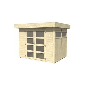 Het tuinhuis Vermont 255x200 cm is een tuinhuis gemaakt van vurenhout. Het huisje is voorzien van een plat dak bekleed met dakleer. Het tuinhuis is 255 bij 200 centimeter groot en heeft een wanddikte van 19 millimeter. De dubbele deuren zijn 175 bij 138 centimeter groot en zijn voorzien van ruiten van kunststof matglas. Daarmee is de inkijk beperkt wanneer het huisje afgesloten is. Dit tuinhuis wordt geleverd inclusief een bijpassende houten vloer, dakleer en hang- en sluitwerk.