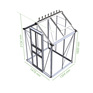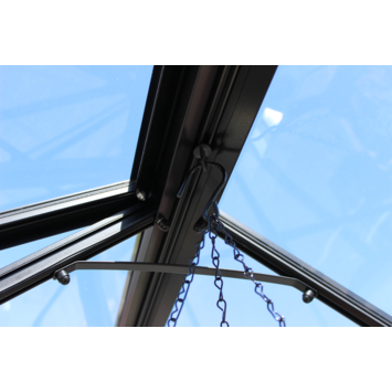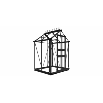De Birdlip 44, zwart gecoat. Zoekt u een kleine tuinkas met stahoogte? Kies dan voor de Birdlip, de kleinste tuinkas ter wereld. Ondanks de kleine afmetingen is deze vrijstaande kas standaard uitgevoerd met een drempelloze dubbele schuifdeur met slot, 65 cm breed en een deurhoogte van maar liefst 187 cm. U gaat dus niet gebukt de kas in! Voor de extra brede goot met een breedte van 80 mm worden gratis 2 regenpijpen met een diameter van 40 mm meegeleverd. De Birdlip kas wordt geleverd met 3 mm dik veiligheidsglas. De afdichting wordt gefixeerd met kunststof beglazingsstrips. Het voordeel van veiligheidsglas: de ruiten worden geleverd in lange ruiten en tot 6 keer sterker dan tuindersglas en zeer duurzaam. Het frame van de Birdlip is standaard leverbaar in een blanke uitvoering. Voor een meer luxueuze uitstraling en / of eenheid met de omgeving waarin de kas wordt geplaatst is deze kas leverbaar in een zwarte of klassiek donkergroen gecoate uitvoering. Een goede beluchting is van levensbelang in de kas. Daarom is de Birdlip voorzien van 1 dakraam in model 44 en 2 dakramen in de twee grootste modellen; 46 en 48. Voor optimaal gebruiksgemak wordt het gebruik van een automatische raamopener geadviseerd. Deze raamopeners zijn temperatuurgevoelig en openen of sluiten het dakraam automatisch. Voor een stabiele en sterke basis is een funderingsrand noodzakelijk. De Birdlip wordt standaard (gratis) geleverd met een aluminium funderingsrand van 8 cm hoog. Indien u kiest voor een zwart of donkergroen gecoate kas wordt ook de fundering in deze kleur meegeleverd. De victoriaanse nok op de productfoto is optioneel en wordt niet standaard meegeleverd.