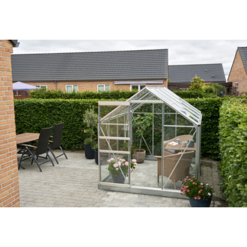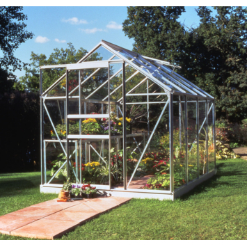 De Popular 86, blank. Deze kas doet zijn naam eer aan: wereldwijd wordt van hobbyist tot gevorderde kweker met plezier gebruik gemaakt van dit model! Deze tuinkas biedt veel waar voor zijn geld. De Popular kas is leverbaar in 4 verschillende lengtes, 2 verschillende kleuren en 3 verschillende afdichtingen! U kunt de kas dus samenstellen naar eigen wens. Het glas of polycarbonaat wordt met behulp van glasklemmen vastgezet, en tuindersglas met behulp van glashaken ‘dakpansgewijs gestapeld’. Hierbij overlappen de ruiten ongeveer 1 cm. Een goede beluchting van de kas is van levensbelang voor alle gewassen. De Popular kas is voorzien van maximaal 2 dakramen in de grootste modellen. De Popular is leverbaar in een blank aluminium of donkergroen gecoate uitvoering. Een bijpassende stalen fundering is apart verkrijgbaar en vormt de basis voor jarenlang kweekplezier. Het gebruik van een stabiele fundering is noodzakelijk voor het optimaal laten functioneren van de kas en biedt de juiste basis voor jarenlang kweekplezier!