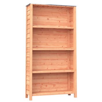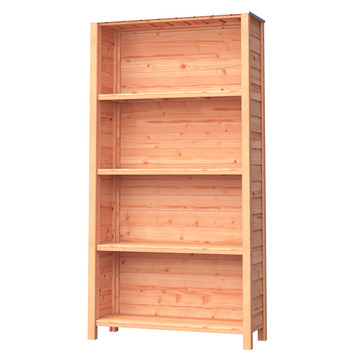 Deze open tuinkast is ideaal voor het opbergen van potten, planten en klein tuingreedschap. Deze tuinkast is gemaakt van onbehandeld Douglas hout. Douglas is van nature een sterke houtsoort en gaat zonder extra behandeling 10 tot 15 jaar mee. Om de Douglas kleur te behouden en vergrijzing te voorkomen kan gebruik gemaakt worden van buitenbeits. Dit brengt ook als voordeel mee dat de maximale levensduur verlengt kan worden.