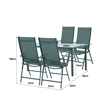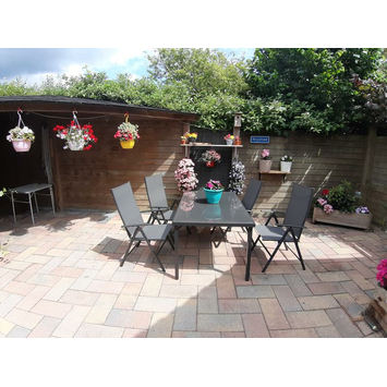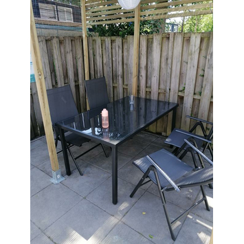 Met de Tuinset Nantes ben je direct voorzien van een complete set, om er zomers intensief gebruik van te maken. De Tuinset Nantes bestaat uit een tafel met glazen blad en stalen frame (150x90 cm) plus 4 standenstoelen met een textileen zitting. De stoelen zijn te verstellen in 3 verschillende standen en inklapbaar, waardoor deze gemakkelijk op te bergen zijn. De set is zeer onderhoudsvriendelijk en weerbestendig. Kortom, met deze luxe buitenset ben je verzekerd van comfort!