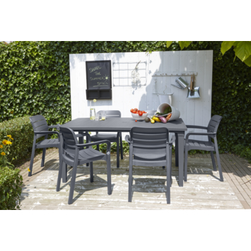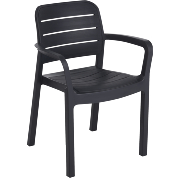 De tuinstoel Romy in zwart combineert comfort, stijl en gebruiksgemak in één. Met een zithoogte van 45 cm biedt deze stoel een ideale zitpositie, perfect voor ontspannen momenten in de tuin of op het terras. Het kunststof materiaal is niet alleen lichtgewicht en gemakkelijk te verplaatsen, maar ook bestand tegen regen, zon en vuil, wat hem zeer geschikt maakt voor langdurig buitengebruik. Het onderhoudsvriendelijke ontwerp zorgt ervoor dat je de stoel eenvoudig schoon houdt met slechts een vochtige doek.