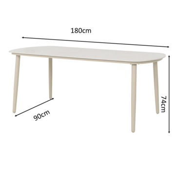 De hoogte tot onderkant tafel is 72,8 cm en het tafelblad is 1,2 cm dik, wat zorgt voor stabiliteit en comfort. Het gecoate frame in beige beschermt tegen weersinvloeden en geeft een verzorgde uitstraling.