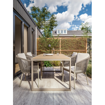 De tuintafel Tulum voor 6 personen combineert taupekleurige metalen poten met een stevig polywood blad en geeft je terras direct een verzorgde uitstraling.