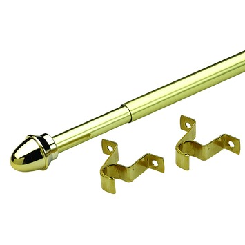 De uitschuifbare caferod goud 160-305 cm is een stijlvol gordijnsysteem om lichte gordijnen aan op te hangen. De roede is uitschuifbaar tussen de 160 en 305 cm en kan binnen deze breedte makkelijk op maat worden gemaakt door het schuifsysteem. De set wordt compleet geleverd en bestaat uit een roede, montagesteunen en eindknopjes.