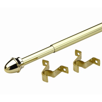 De uitschuifbare caferod goud 50-75 cm is een stijlvol gordijnsysteem om lichte gordijnen aan op te hangen. De roede is uitschuifbaar tussen de 50 en 75 cm en kan dus makkelijk op maat worden gemaakt binnen deze breedte. De set wordt compleet geleverd en bestaat uit een roede, montagesteunen, ringen om je gordijn aan op te hangen en eindknopjes.