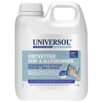 De UNIVERSOL verfreiniger draagt het EU Ecolabel. Dat betekent dat de reiniger voldoet aan strenge Europese eisen voor milieubelasting, veiligheid en prestatie. De ontvetter is geschikt voor harde oppervlakken zoals geverfde ondergronden, hout en metaal en kan binnen en buiten worden gebruikt. Niet gebruiken op zachte kunststoffen of onbehandeld aluminium. Draag altijd handschoenen en bewaar buiten bereik van kinderen.