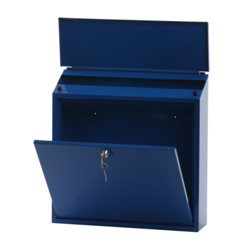 Deze Blauwe V-part Malagan wandbrievenbus is voorzien van een cilinderslot met 2 sleutels. De inworpopening aan de bovenkant zit onder de klep, zodat de post beschermd is. De inworpopening heeft een breedte van 35,8 cm en een hoogte van 4 cm.