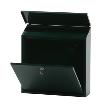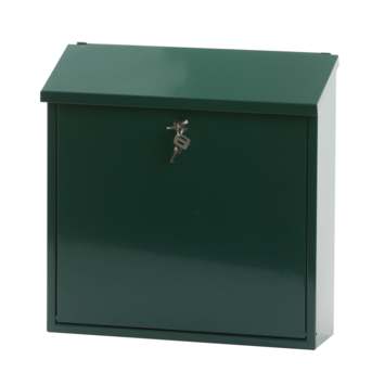 Deze Groene V-part Malagan wandbrievenbus is voorzien van een cilinderslot met 2 sleutels. De inworpopening aan de bovenkant zit onder de klep, zodat de post beschermd is. De inworpopening heeft een breedte van 35,8 cm en een hoogte van 4 cm.