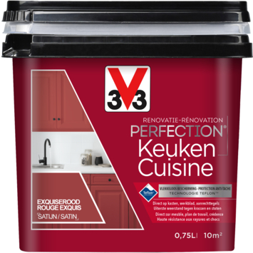 Pak je keuken aan met V33 renovatieverf. Deze handige verf is geschikt voor veel verschillende type ondergronden zoals; hout, multiplex, gipsplaten, glas, inox, metaal, kunststof. Daarnaast hoef je bij het gebruik van deze keukenverf geen primer te gebruiken. Door de TeflonTM technologie is de verf goed bestand tegen warmte en kan daardoor ook gebruikt worden op de spatwand achter een kookplaat. En de v33 renovatieverf keuken heeft een hoge weerstand tegen krassen en stoten.