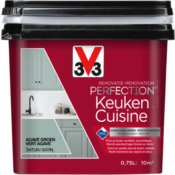 Met de V33 Renovatieverf Perfection Keuken agavegroen 750 ml kun je zonder gedoe zelf je keuken opfrissen. Deze renovatieverf is geschikt voor keukenmeubels, aanrechttegels, werkbladen en zelfs elektrotoestellen, of ze nu nieuw of oud zijn. Je hoeft geen primer te gebruiken en ook afbijten is niet nodig. Dat maakt het schilderen een stuk makkelijker.