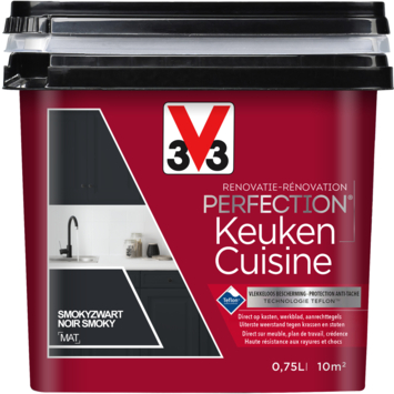 Met de V33 Renovatieverf Perfection Keuken smokyzwart 750 ml kun je zonder gedoe zelf je keuken opfrissen. Deze renovatieverf is geschikt voor keukenmeubels, aanrechttegels, werkbladen en zelfs elektrotoestellen, of ze nu nieuw of oud zijn. Je hoeft geen primer te gebruiken en ook afbijten is niet nodig. Dat maakt het schilderen een stuk makkelijker.