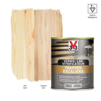 V33 trappenvernis kleurloos zijdeglans 750 ml is specifiek voor afwerking van trappen. De kleurloze vernis heeft een antidruip- en antislipformule. De inhoudsmaat is 750 ml.