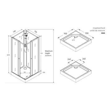 De Van Marcke douchecabine set is een compleet douchepakket met hoekinstap. De bodem is voorzien van een anti-sliplaag waardoor je niet bang hoeft te zijn om uit te glijden. De glazen schuifdeuren hebben een magnetische sluiting. Zo weet je zeker dat de deuren gesloten blijven tijdens het douchen. De achterwanden zijn gemaakt van 4mm wit veiligheidsglas en de deuren van 5mm veiligheidsglas. De bodem is geschikt voor een gewicht van maximaal 120kg. De douchekop bevat de standen regen, massage, bubble, regen+massage en regen+bubble. Zo kun je altijd zelf de meest prettige stand kiezen. Ben je op zoek naar een complete douchecabine en een douchekop met meerder standen? Dan is de Van Marcke Parma douchecabine set 90x90 wat je zoekt.