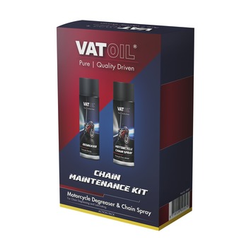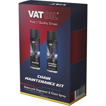 De VatOil ketting onderhoudsset bevat twee hoogwaardige producten speciaal ontwikkeld voor het ontvetten en smeren van motorfietskettingen. Degreaser verwijdert snel en effectief olie en vet. Naast de ketting, is het o.a. ook toepasbaar op tandwielen, motorblok en frame; de formule van Degreaser verwijdert olie en vet van alle verontreinigde plaatsen. Motorcycle Chain Spray is door zijn bijzondere samenstelling heel goed bestand tegen hoge temperaturen. De non-fling formule gaat afslingeren tegen en houdt de velg daarmee schoon. Vanwege de penetrerende en vochtwerende eigenschappen is deze kettingspray ook bijzonder geschikt voor het smeren van alle draaiende en moeilijk bereikbare smeerpunten. Ontwikkeld voor gewone en O-/X-/Z-Ring kettingen. Ketting goed reinigen met Degreaser. Daarna inspuiten met Motorcycle Chain Spray. Voor gebruik goed schudden!