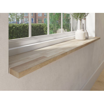 Een massieve vensterbank volledig gemaakt van echt hout met natuurlijke variëteit in kleur en uitstraling.Doordat het paneel massief is en dus bestaat uit meerdere aan elkaar gelijmde latten trekt het hout minder snel krom. Het paneel is 27mm dik en is aan één lange zijde afgerond (radius 6) wat de vensterbank een strakke uitstraling geeft. Het hout is FSC gecertificeerd en daarmee afkomstig uit duurzaam beheerde bossen.