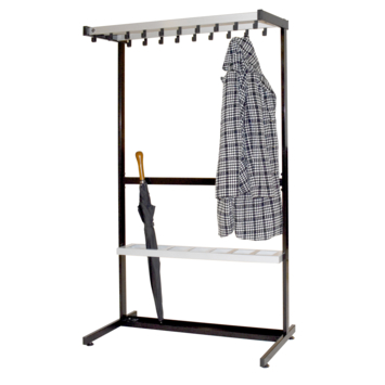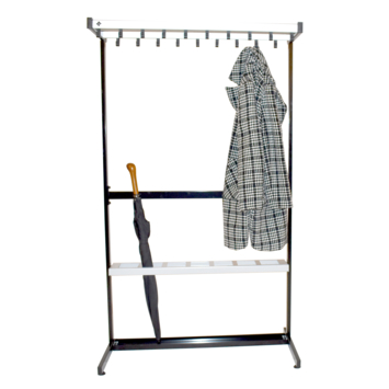 Met 19 dubbele metalen haken is er meer dan genoeg ruimte voor jassen, tassen of andere items. De stevige metalen constructie, afgewerkt in grijs met zwarte details, zorgt voor een duurzame en representatieve uitstraling die past in elke professionele omgeving.