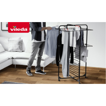 Compact, stijlvol en verrassend ruim: de Vileda Mixer 3 Ultimate Black biedt tot 30 meter drooglengte zonder dat hij veel plaats inneemt. Dankzij de uitklapbare plateaus en soepele wieltjes droog je eenvoudig al je was, waar je maar wilt.