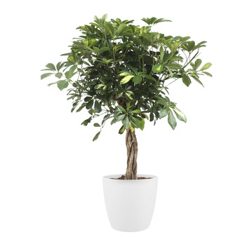 Maar laten we de plant niet vergeten! Deze Gold Capella Vingerboom wordt, door de contouren van de bladeren en zijn hoogte, ook wel de 'dwergparapluboom' genoemd. De plant groeit tot een hoogte van ongeveer 1 meter en heeft een stevig gevlochten stam met relatief veel groene blaadjes. Deze plant is een vrij eenvoudig te verzorgen huisplant waar je geen speciale vaardigheden voor nodig hebt. Oorspronkelijk komt deze plant uit Taiwan, maar dankzij GAMMA haal je hem eenvoudig je woonkamer in. In de GAMMA webshop kun je deze plant ook met een zwart-, soap- of antraciet kleurige Elho bloempot kopen.