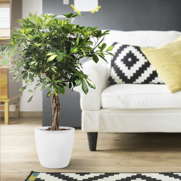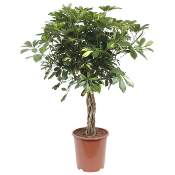 De Vingerboom, ook wel Gold Capella genoemd, heeft een gevlochten stam met groene blaadjes. Op sommige van de bladeren zijn ook lichtgroene/gele tinten te vinden. Deze kamerplant is ongeveer 100 cm hoog en heeft een potmaat van 27 cm in diameter. Het is een relatief makkelijke kamerplant. Groene vingers zijn dan ook geen vereiste. Hoewel deze Vingerboom oorspronkelijk uit Taiwan komt, haal je hem danzkij GAMMA eenvoudig je woonkamer in.