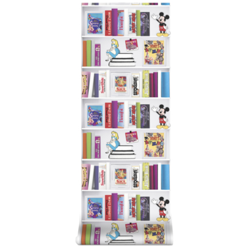 Vliesbehang Disney boekenkast multicolour 106455 maakt verwijzingen naar alle grote Disney klassiekers. Je muur lijkt met dit behang een grote boekenkast. Ook bekende figuren als Alice in Wonderland en Mickey hebben een plekje gekregen op dit te gekke behang. Papierbehang is eenvoudig aan te brengen. Laat de lijm korte tijd in het behang trekken voordat het op de muur aangebracht wordt. Voor het beste resultaat dien je ervoor te zorgen dat de ondergrond schoon, droog, vlak en egaal van kleur is. Een rol is 52 cm breed en er zit 10 meter op een rol.