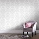 THis wallpaper has a lovely shimmer of silver pattern on white. The white absorbs the light that shines on it, so takes up the colour of my cream blinds and curtains and the silver pattern reflects white. The paper is of a good quality and as with all paste the wall you need to make sure the wall is smooth and sealed. I used a standard white emulsion first (rollered on thin) and I saved about a third of my time wallpapering. No messy/soggy paper hanging around as off cuts and treading in them like I usually do. Fantasic, makes my lounge/diner look really classy and expensively decorated