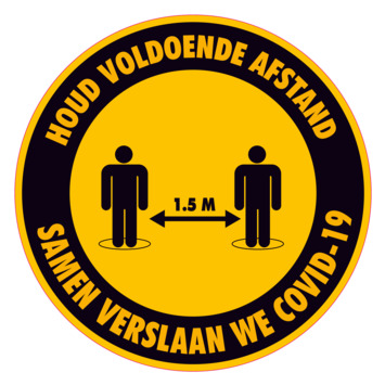 Ronde vloersticker met de tekst "Houd voldoende afstand, 1,5 m, samen verslaan we Covid-19". De waarschuwingssticker - vloersticker heeft een doorsnee van 25 cm. Creëer eenvoudig een wachtrij of herinner mensen regelmatig aan de geldende corona maatregelen. Raadpleeg voor corona-advies altijd de overheid.