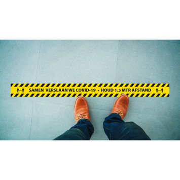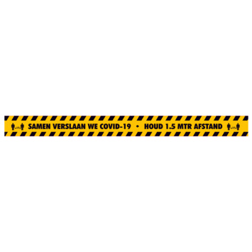 Vloersticker strook met de tekst “ Samen verslaan we Covid-19 - Houd 1.5 mtr afstand”. Deze vloersticker helpt mensen om 1,5 m afstand te houden. Creëer eenvoudig een wachtrij of herinner mensen regelmatig aan de geldende corona maatregelen. Raadpleeg voor corona-advies altijd de overheid.