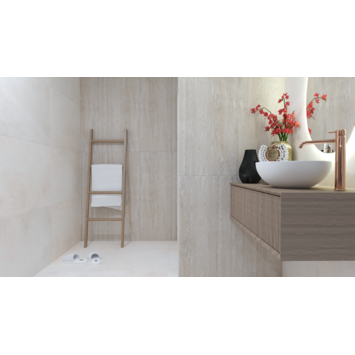 Deze travertin keramische tegel van 60x120 cm geeft je interieur de uitstraling van natuursteen en past goed in woonkamers en keukens. De beige kleur zorgt voor een rustige en stijlvolle sfeer die bij veel stijlen past. Dankzij de gerectificeerde en geglazuurde afwerking liggen de tegels strak tegen elkaar en maak je ze makkelijk schoon. Met een dikte van 10 mm zijn ze stevig en gaan ze lang mee. In een verpakking zit 1,44 m² aan tegels. De combinatie van een natuurlijke look en praktische eigenschappen maakt deze tegel geschikt voor verschillende woonruimtes.