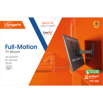 Zoek je een draaibare tv beugel, zodat je nog fijner van je tv kunt genieten? Een tv beugel die bovendien snel en eenvoudig te monteren is? Wij hebben ‘m voor je gevonden: de QUICK Full-Motion tv beugel van Vogel’s. Je installeert hem in nog geen 30 minuten aan de muur. Daarna heb je er jarenlang plezier van. De Vogel’s QUICK Full-Motion tv beugel is geschikt voor tv’s van 32 t/m 65 inch met een gewicht van maximaal 25 kg. Om de ideale kijkhoek in te stellen draai of kantel je de tv eenvoudig naar je toe. De tv beugel heeft een draaihoek tot 120° en je kunt hem 15° kantelen. Naast de tv beugel vind je in de verpakking ook een boormal, schroeven, pluggen, een waterpas en een kabelbinder om je kabels netjes bij elkaar te binden. Handig is ook de DrillRight™ AR App van Vogel’s. Hiermee teken je eenvoudig het eerste boorgat af. De Vogel’s QUICK Full-Motion tv beugel is TÜV-gecertificeerd en getest op maar liefst driemaal het maximale gewicht. Daarmee voldoet de tv beugel aan de strengste veiligheidsnormen. Garantie: 5 jaar.
