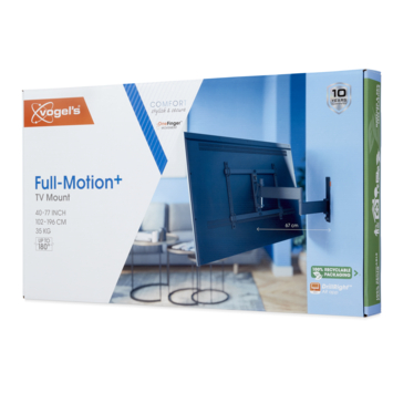 Wil je op een comfortabele manier van je grote flatscreen tv genieten vanuit elke hoek? Zoek je een stijlvolle, draaibare tv-beugel die bestand is tegen het gezinsleven? Dan is de COMFORT Full-Motion+ tv-beugel van Vogel’s precies wat je nodig hebt. Deze beugel kan maar liefst 180° draaien en 20° kantelen. Hij is geschikt voor tv’s van 40 tot 77 inch met een maximaal gewicht van 35 kg. Dankzij de One-Finger™ Movement technologie kun je de tv met slechts één vinger in de gewenste positie draaien. Het TiltAnchor™ systeem zorgt ervoor dat je tv veilig kan worden gekanteld en gefixeerd.