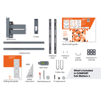 De installatie van de Vogel’s COMFORT Full-Motion+ tv-beugel is eenvoudig. Je ontvangt een boormal, schroeven, fischer® DuoPower pluggen, een waterpas en een kabelbinder. Met de gratis DrillRight™ AR App van Vogel’s kun je eenvoudig je eerste boorgat bepalen. Deze tv-beugel is TÜV-gecertificeerd en getest op maar liefst drie keer het maximale gewicht, waardoor hij voldoet aan de hoogste veiligheidseisen. Bovendien krijg je op de COMFORT tv-beugel 10 jaar garantie.