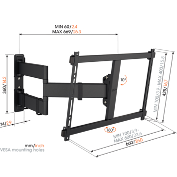 Ontdek de COMFORT Full-Motion+ TV beugel, geschikt voor TV's tot 100 inch en 55 kg. Met een draaibereik van 180° en een kanteling van 10° geniet je altijd van optimaal kijkcomfort. Dankzij Vogel's One-Finger™ Movement draai je je TV eenvoudig met één vinger. De lange armen zorgen ervoor dat je TV tot 69 cm van de muur kan komen.