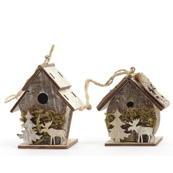 Dit Vogelhuis schors rendier is een kersthanger voor in uw kerstboom. Voor het vogelhuisje van schors staat een boompje met rendier. Er zijn 2 soorten huisjes verkrijgbaar. De afmeting is (lxbxd): 6x4x7.5cm. Dit artikel is alleen verkrijgbaar in de bouwmarkten.