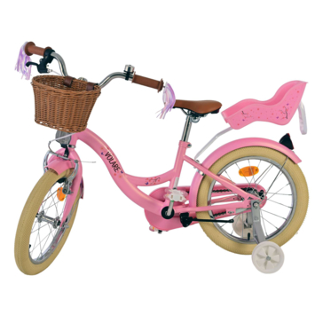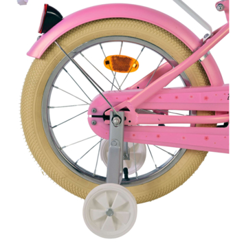 De Volare Blossom 16 inch kinderfiets in roze maakt leren fietsen extra leuk! Veiligheid staat voorop met de handrem, terugtraprem, afneembare zijwieltjes en de gesloten kettingkast. Zo kan je kind zorgeloos de weg op.